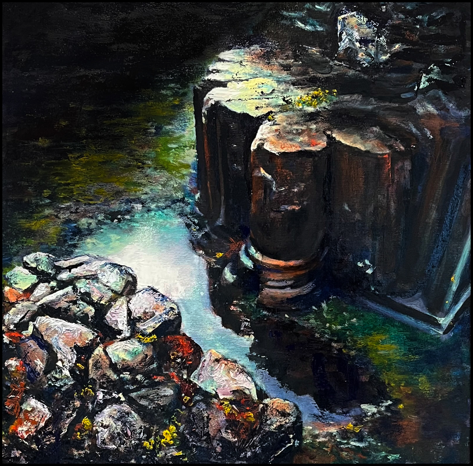 Reflecting on Inch Abbey, Downpatrick, 2025.. Oil on canvas. Framed size 55 x 55 cm. €470